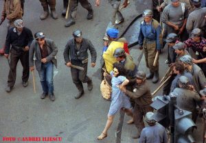 „O fotografie este emblematică pentru mineriada din 13-15 iunie 1990. O femeie îmbrăcată într-o rochie albastră este luată pe sus de mai mulți mineri cu bâte în mâini. Imaginea este tragică prin întrebările pe care le ridică: unde este dusă femeia și ce se va întâmpla cu ea?
